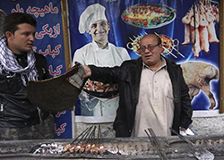 В обеденное время занятым оказался всего один стол — посетители заказали нежное мясо на длинных вертелах и другие традиционные афганские блюда. Никто из них, кажется, не знаком с хозяином, гости говорят, что пришли сюда только потому, что закрылось ближайшее кафе, где готовили блюдо из афганской лапши.