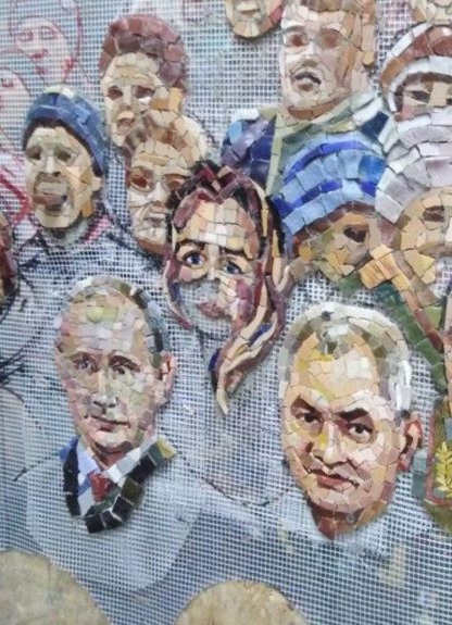 | Икона с ликом Сталина | Фрагмент мозаики с портретом путина в храме Вооруженных сил России. Фото: МБХ-медиа |
