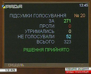 Верховная Рада в стремительном темпе (7 апреля внесен, 9 апреля принят «за основу и в целом») и с незаурядным единодушием (за — 271, против — 0, воздержалось — 0) поддержала Законопроект «Про правовий статус та вшанування пам'яті борців за незалежність України у ХХ столітті». Почти что ставший законом проект содержит перечень «органів влади, організацій, структур та формувань», деятельность которых должна прославляться, а также предупреждает (не только граждан Украины, но и иностранцев!) об ответственности за недостаточно восторженный образ мысли: «Громадяни України, іноземці, а також особи без громадянства, які публічно проявляють зневажливе ставлення до осіб, зазначених у статті 1 даного Закону, перешкоджають реалізації прав борців за незалежність України у XX столітті, несуть відповідальність відповідно до чинного законодавства України».