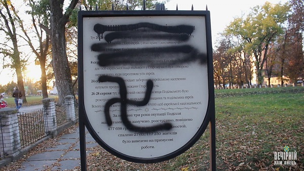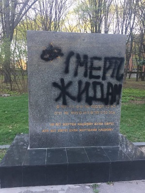 Среди инцидентов подобного рода, зафиксированных в прошлом году: осквернение мемориала Скорбящей матери в Полтаве, поджог мемориала памяти жертв Холокоста в Тернополе, граффити и вандализм в отношении «кубов памяти» во Львове и др. К этой же категории я отнес дымовую шашку, брошенную в львовский книжный магазин, где должна была проходить лекция о Холокосте.
